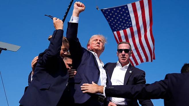 ▲ 지난 13일 총격 직후 지지자들을 향해 주먹을 지켜드는 도널드 트럼프