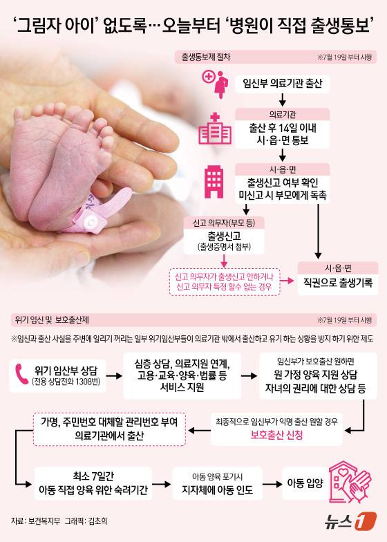 (서울=뉴스1) 김초희 디자이너 = 19일부터 의료기관에서 태어난 아동의 출생 사실과 관련 정보가 지자체에 자동으로 통보된다. 이로써 병원에서 태어난 모든 아동이 부모의 출생신고 여부와 상관없이 공적 체계의 보호를 받게 된다. 이와 동시에 아이를 양육하기 어려운 위기임산부가 의료기관에서 가명으로 출산할 수 있는 길도 열린다.