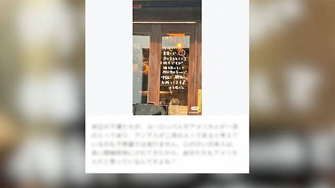 식당 창문으로 추정되는 곳에 "다양성, 관용을 말하고 있는 요즘이지만, 싫은 생각을 가지고 일할 생각은 없기 때문에 중국인, 한국인은 거절합니다"라는 말이 일본어로 적혀 있습니다.