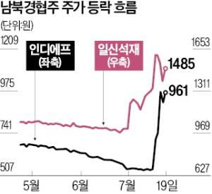 19일 유가증권시장에서 인디에프는 5.49% 상승한 961원에 거래를 마쳤다. 이 종목은 지난 14일 총격 사태 직후 두 번(15일, 17일) 가격제한폭에 도달했고, 전날엔 주가가 -5.4% 하락했다. 시가총액은 지난 12일 408억원에서 5거래일 만에 722억원으로 불어났다. 함께 남북경협 테마주로 묶인 삼부토건(-6.22%), 현대엘리베이터(3.95%), 일신석재(6.6%) 주가도 요동쳤다. 15일부터 2거래일간 나란히 올랐다가 이후 급등락을 반복했다. 이 중 시가총액이 1150억원으로 가장 적은 일신석재는 전날 9.91% 내리는 등 변화가 심했다.