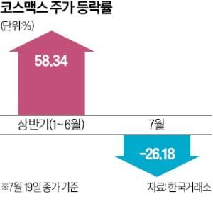 코스맥스는 19일 유가증권시장에서 11.98% 하락한 14만7700원에 거래를 마쳤다. 1분기 호실적에 수출 기대가 커지며 올 상반기 주가가 58% 뛰었다. 하지만 연고점(6월 27일)을 찍은 뒤 미끄럼을 타고 있다. 이달 들어 주가는 26.18% 빠졌다.