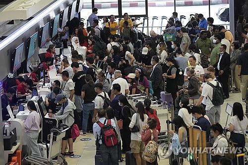 Passengers line up for check in at Don Mueang International Airport in Bangkok, Thailand, Friday, July 19, 2024. Travelers in Thailand, as in other parts of the world, were inconvenienced by a major internet outage that disrupted flights, in addition to affecting banks, media outlets and other businesses. (AP Photo/Sakchai Lalit)