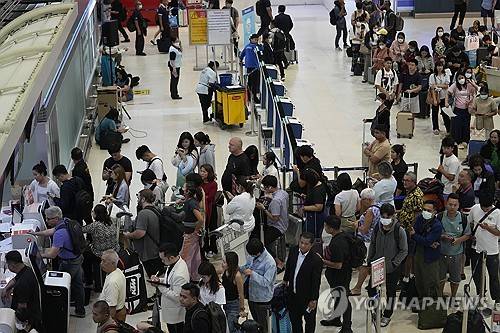 Passengers line up for check in at Don Mueang International Airport in Bangkok, Thailand, Friday, July 19, 2024. Travelers in Thailand, as in other parts of the world, were inconvenienced by a major internet outage that disrupted flights, in addition to affecting banks, media outlets and other businesses. (AP Photo/Sakchai Lalit)