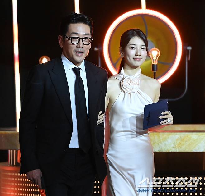 제3회 청룡시리즈어워즈(Bluedragon Series Awards)가 19일 인천 파라다이스시티에서 열렸다. 시상자로 나온 하정우, 수지 모습. 인천=허상욱 기자 wook@sportschosun.com/2024.07.19/