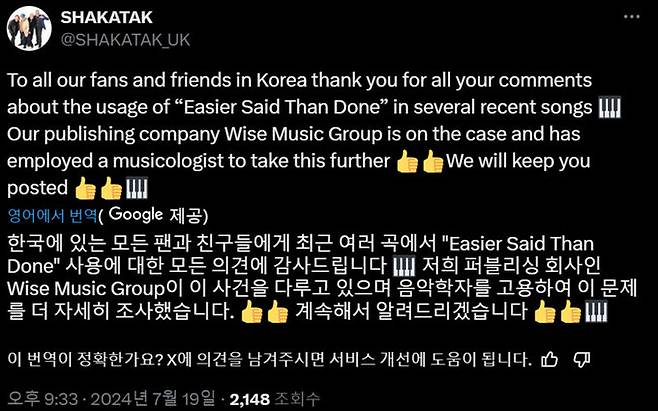 19일 샤카탁은 X(구 트위터)를 통해 “한국에 있는 모든 팬과 친구들에게 최근 ‘이지어 새드 댄 던’(Easier Said Than Done)’ 사용에 대한 모든 의견에 감사드린다”며 “퍼블리싱 회사인 와이즈 뮤직 그룹이 이 사건을 다루고 있다”고 적었다.
