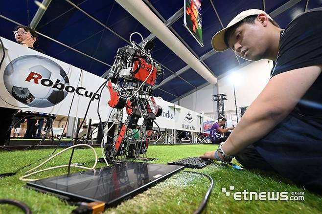 로보컵 2024 세계대회가 17일부터 22일까지 네덜란드 에인트호번 제네퍼파크 실내스포츠센터에서 열렸다. 로보컵 축구 한국대표로 참가한 광운대학교 로봇게임단 로빛(ROBIT) 학생들이 경기 준비에 매진하고 있다.