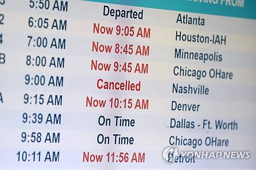 Cancelled and delayed flights are seen on a monitor at the Des Moines International Airport, Friday, July 19, 2024, in Des Moines, Iowa. (AP Photo/Charlie Neibergall)
