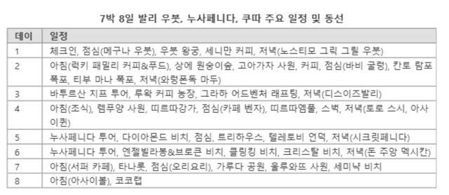 발리 7일차 일정은 그 어느날보다 타이트했다. 이날 하룻동안만 유튜버 '빠니보틀'도 방문한 '타나 롯', 발리 북부에 위치한 '가루다 위시누 켄카나 공원', '울루와뚜 사원' 등 총 3곳을 방문했다. 각각의 이동에만 2시간, 1시간 정도 걸리는 조금은 무리한 일정이었다. 발리 중부에서 시작해 남부, 최남단을 거쳐 다시 중부에 있는 숙소로 돌아오는 일정이었다.