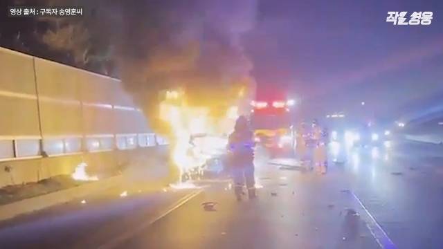 3차로를 달리던 트럭은 이걸 미처 발견하지 못하고 승용차를 그대로 밀어버렸는데, 얼마 뒤 차량은 맹렬하게 불타더니, 이렇게 처참하게 망가져 버렸습니다.