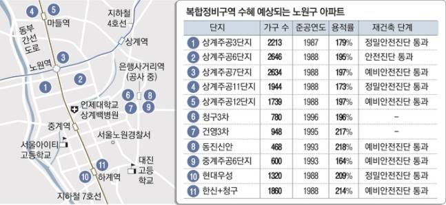 대상이 되는 아파트는 총 11곳입니다. 지하철 4·7호선 노원역 주변 상계주공3·6·7단지와 7호선 마들역 주변 상계주공11·12단지, 7호선 하계역 주변 현대우성·한신·청구, 동북선이 조만간 지날 은행사거리 인근 중계청구3차·건영3차·동진신안·중계주공6단지입니다.