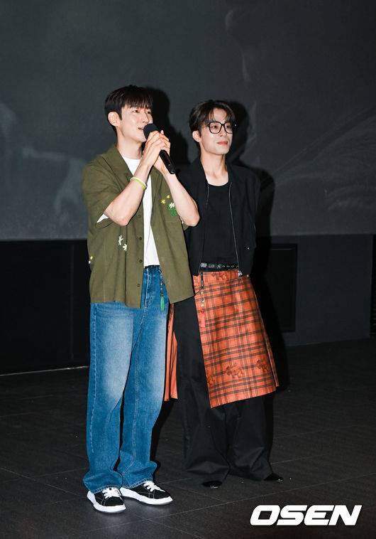 배우 이제훈과 구교환이 팬들과 대화를 나누고 있다.