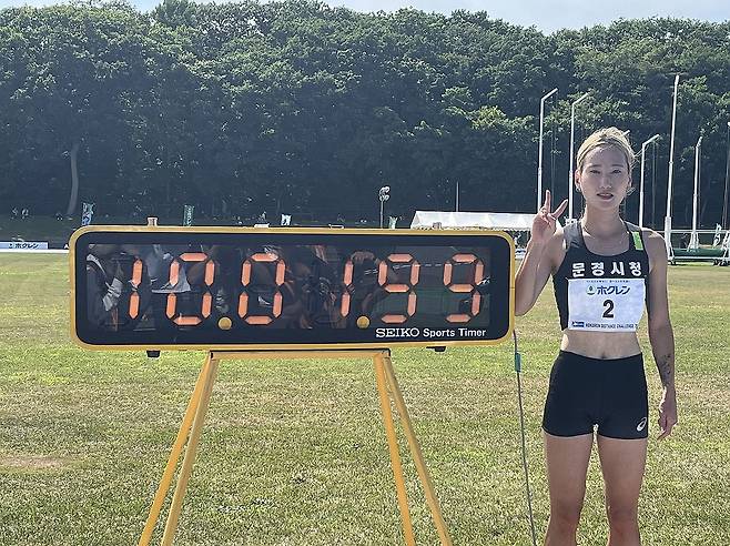 (서울=연합뉴스) 신현우 기자 = 조하림이 20일 일본 홋카이도 지토세시 아오바 육상경기장에서 열린 2024 호쿠렌 디스턴스챌린지 5차 대회 여자부 3,000m 장애물 경기에서 10분01초99를 기록하며 9개월 만에 한국기록을 작성한 뒤 기념 촬영하고 있다. 2024.7.20 [대한육상연맹 제공. 재판매 및 DB 금지]