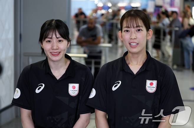 (파리(프랑스)=뉴스1) 박정호 기자 = 일본 배드민턴 대표팀 시다 치하루(왼쪽)와 마쓰야마 나미가 21일 오전(한국시간) 프랑스 파리 샤를 드골 공항을 통해 입국, 취재진과 인터뷰를 하고 있다. 2024.7.21/뉴1
