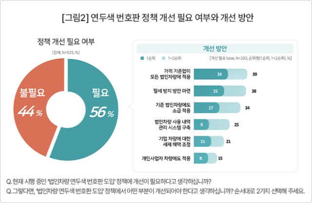 규제를 강화하는 방향으로 제도 개선이 필요하다는 의견은 과반수(56%)에 달했다. 개선 방안으로 △가격 기준 없이 모든 법인차량에 적용(39%) △탈세 방지방안 마련(38%)이 비슷한 수준으로 높았다. 기존 법인차량에 소급 적용(34%)하고 개인사업자 차량에도 적용(15%)해야 한다는 의견도 제시됐다.