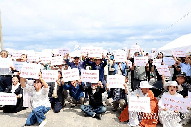 | ▲ 지난 15일 일본 야마구치현 우베시 장생탄광 추모비 앞에서 열린 추모행사 후 참가자들이 '갱구를 열자' 등이 쓰인 피켓을 들어보이고 있다. |
