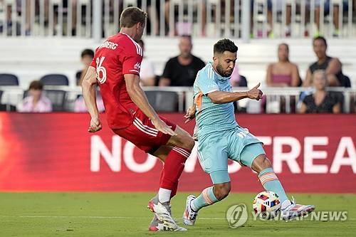 Inter Miami defends Jordi Alba, right, runs with the ball as Chicago Fire defender Wyatt Omsberg, left, defends during the first half of an MLS soccer match, Saturday, July 20, 2024, in Fort Lauderdale, Fla. (AP Photo/Lynne Sladky)