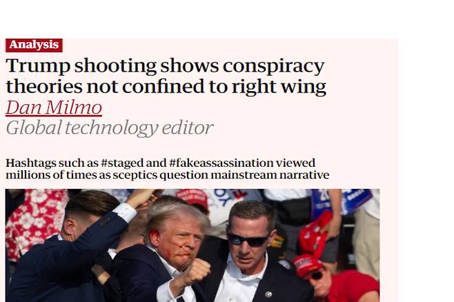 ▶박수정> 이 사건과 관련해서 유명해진 사진, 여기서 경호원들이 웃고 있는 사진이 조작돼 수백만 조회수를기록하면서 일파만파 퍼졌고, AP통신은 이건 조작된 거다 성명을 내고 원본을 다시 보여주고 하는 일도 있었죠. 트럼프 측이 이번 사건을 연출했다, 그 중심에 있는 게 바로 BlueAnon으로 불리는 이들입니다. 워싱턴포스트에서는, 트럼프 피습 사태 이후로 BlueAnon이 주도하는 음모론이 소셜미디어에서 넘쳐나고 있다고 보도했어요.