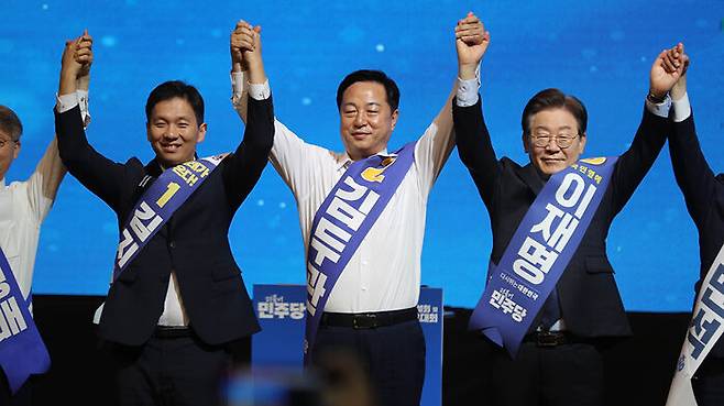 ▲ 더불어민주당 새 지도부 선출을 위한 지역순회 경선 둘째 날인 21일 오전 강원 홍천군 홍천종합체육관에서 열린 합동연설회에서 김지수(왼쪽부터), 김두관, 이재명 후보가 손을 들어 올리며 당원들에게 인사하고 있다.