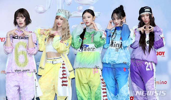 [인천=뉴시스] 김혜진 기자 = 그룹 뉴진스가 21일 오후 인천 중구 인스파이어아레나 리조트에서 열린 2024 SBS가요대전 서머 블루카펫에서 포즈를 취하고 있다. 2024.07.21. jini@newsis.com