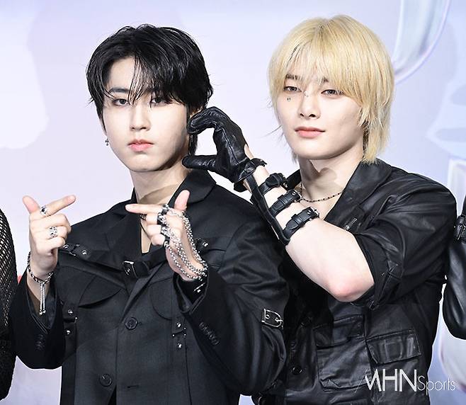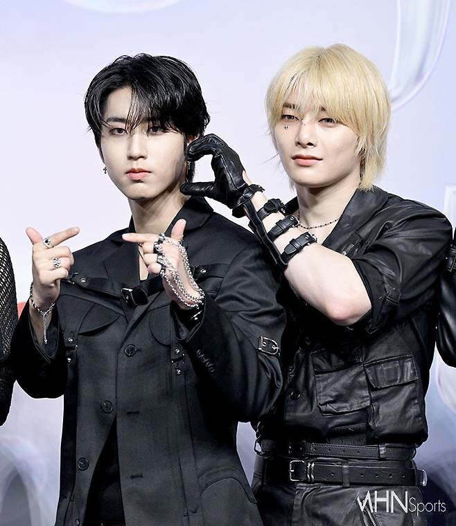 스트레이키즈 한, 아이엔이 포즈를 취하고 있다.