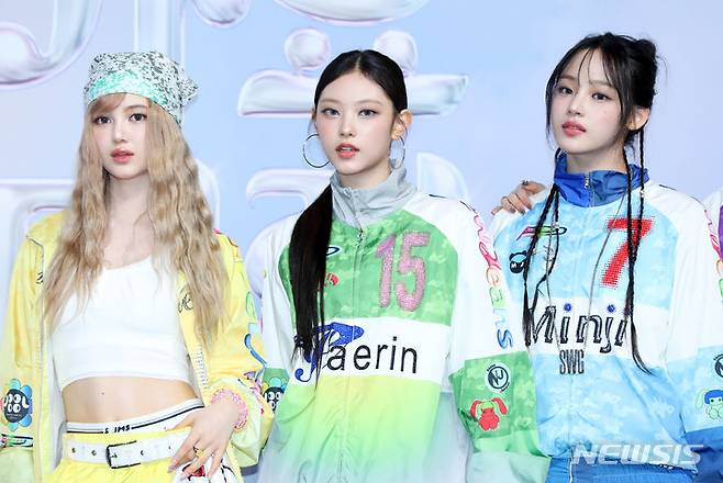 [인천=뉴시스] 김혜진 기자 = 그룹 뉴진스 다니엘(왼쪽부터), 해린, 민지가 21일 오후 인천 중구 인스파이어아레나 리조트에서 열린 2024 SBS가요대전 서머 블루카펫에서 포즈를 취하고 있다. 2024.07.21. jini@newsis.com