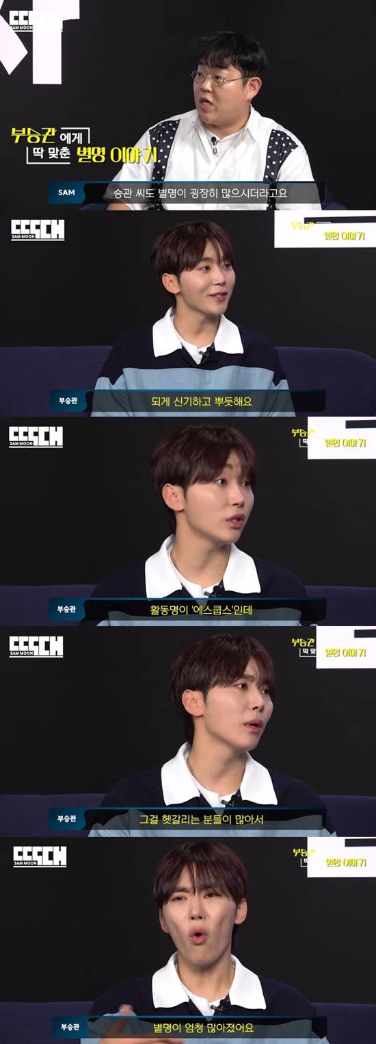 이어 문상훈은 "그런데 또 한편으로는 별명이 많아지다 보면 원래 활동명이 기억이 안 나시거나 하지 않나"라고 물었고, 부승관은 "맞다. 저희 리더 형의 활동명이 에스쿱스인데, 활동명이 어렵다보니까 헷갈리는 분들이 많아서 별명이 엄청 많아졌다"고 말했다.