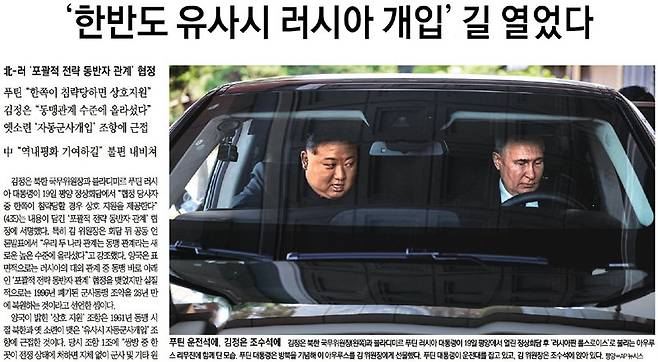 최은봉 위원=6월 19일자 A3면 <푸틴 “분리 불가능한 안보구조 건설”…北-러 관계 수직 상승> 기사는 북한과 러시아가 그동안 조약을 어떻게 변화시켜 왔는지를 다뤘습니다. 두 지도자 모두 장기 집권하고 있는 만큼 일반적 국가의 조약과는 다른 성격이 있다는 점도 설명했으면 좋았을 것입니다. 6월 22일자 26면 <북-러 브로맨스 지켜보는 중국의 복잡한 속내> 칼럼은 중국의 입장을 잘 설명했습니다. 중국은 북한의 안보 전략적 가치를 인정하는 반면 러시아는 북한에 대해 포탄 등 군사적 지원을 받는 방식으로 접근합니다. 이런 것들이 앞으로 동북아시아 안보 지형에 어떤 영향을 미칠지 다뤄야 합니다. ‘신냉전’이라는 표현을 자주 쓰는데 현재 정세는 단순한 진영 간 대결로만 볼 수 없습니다. 보다 정교한 접근이 필요합니다. 6월 20일자 A1면에 게재된 블라디미르 푸틴 러시아 대통령이 김정은 북한 국무위원장을 태우고 운전석에 앉은 사진은 인상적이었습니다.
