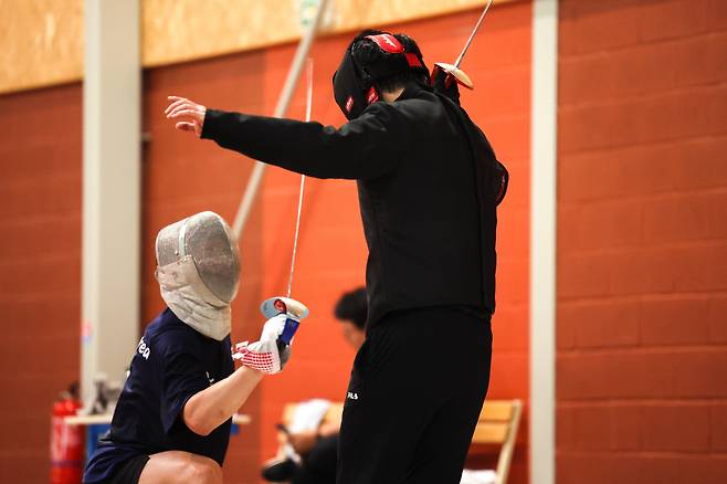 [헤럴드경제(퐁텐블로)=이상섭 기자] 2024 파리올림픽 펜싱 남자 사브르 단체전에 출전하는 박상원이 21일(현지시간) 프랑스 퐁텐블로시에 위치한 프랑스국가방위스포츠센터(CNSD)에 마련된 팀 코리아 파리 플랫폼에서 훈련하고 있다.