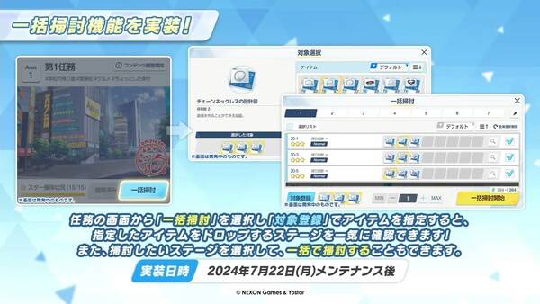 일괄 소탕 기능이 도입된다. 필요한 장비를 설정하면 해당 장비가 나오는 스테이지를 단번에 확인할 수 있다. 또한 원하는 스테이지를 체크해서 소탕을 진행하는 것도 가능하다.
