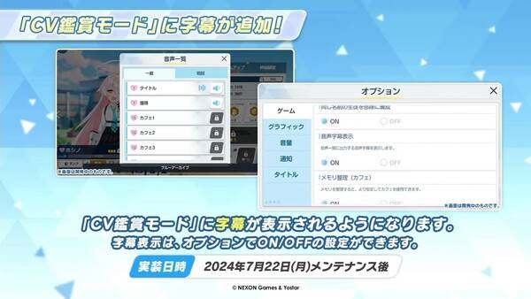 캐릭터 보이스 감상 모드가 추가된다. 자신이 원하는 캐릭터의 대사를 선택해서 들을 수 있는 기능이다. 호감도 레벨이 높을수록 많은 대사를 듣는 게 가능하니 미리 호감도를 높여두는 게 좋다.