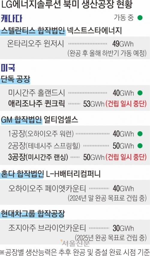 2022년 LG엔솔과 GM이 미국 미시간주 랜싱에 짓기 시작한 제3공장은 총투자액 26억 달러(약 3조 6176억원) 규모로 올해 하반기 준공 예정이었다. 애초 계획대로라면 내년 초 1단계 양산을 시작해 향후 연 생산 규모 50GWh에 달하는 공장으로 확대할 예정이었다. 이는 1회 충전 시 500㎞ 이상 주행이 가능한 고성능 순수 전기차를 약 70만대 생산할 수 있는 양이다.