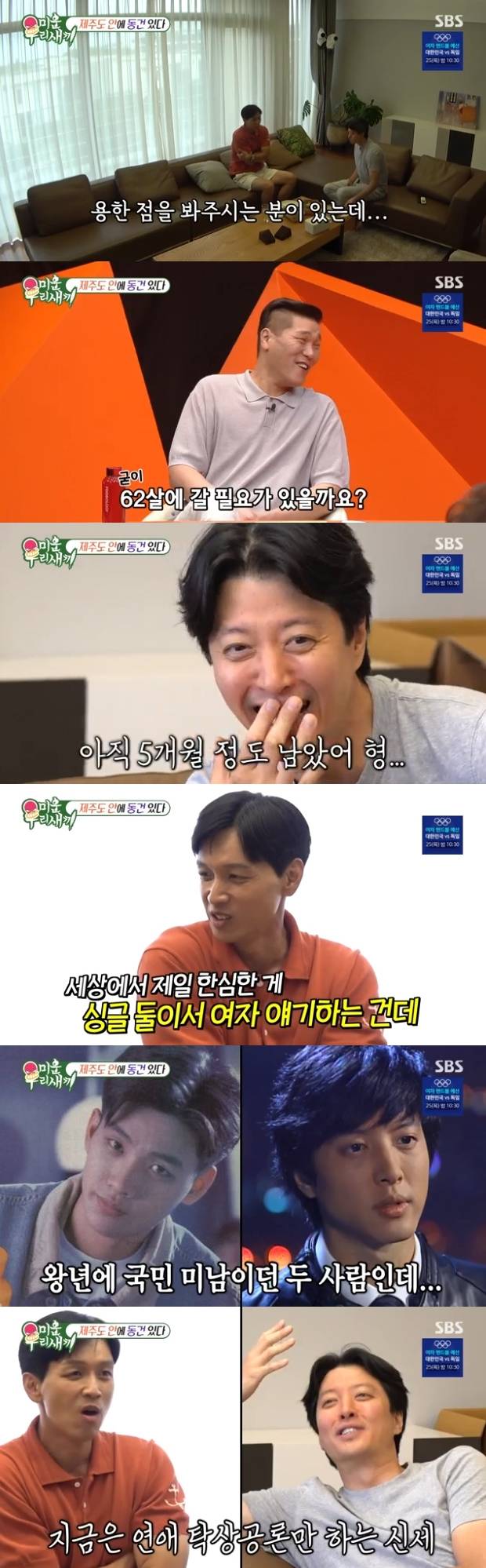 구본승은 "세상에서 제일 한심한 게 싱글 둘이서 여자 얘기하는 건데 이걸 몇 시간 동안하고 있다. 진짜 한심하다"라고 자조해 웃음을 자아냈다. 이동건도 "진지하게 이 이야기를 하고 있다. 제주도에서"라며 웃었다. 이를 지켜보던 서장훈도 "제주도까지 가서 밖에 안 나가고 뭐 하는 것이냐"라고 덧붙였다.