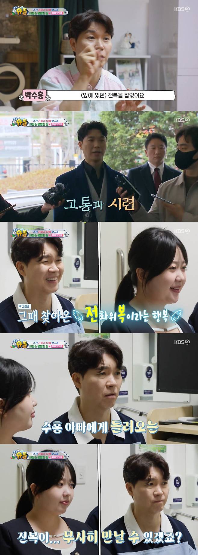 가정사로 고통 받은 박수홍. 박수홍은 그때를 떠올리며 "제 몸 하나 버틸 겨를이 없더라"라고 밝혔다. 그러나 "전복이를 가지게 되면서 좋은 상황들이 많이 생겼다"고 전화위복이 되었다고 밝혔다.
