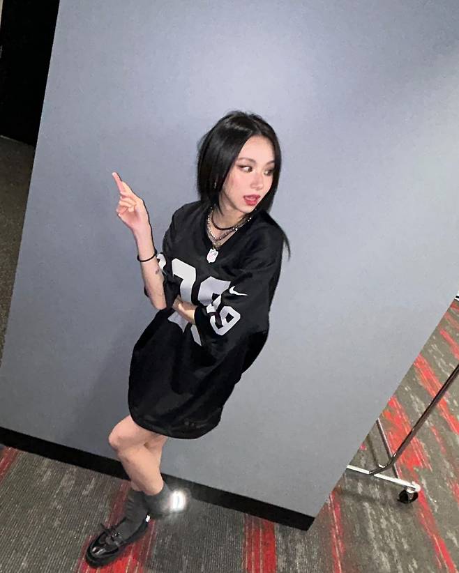 채영은 색다른 무드의 블록코어 룩으로 자신의 개성을 표현합니다. 빅 사이즈 미식축구 유니폼을 단독으로 입어 미니원피스처럼 연출한 뒤 여러 개의 네크리스를 레이어드해 펑키한 무드를 강조했어요.