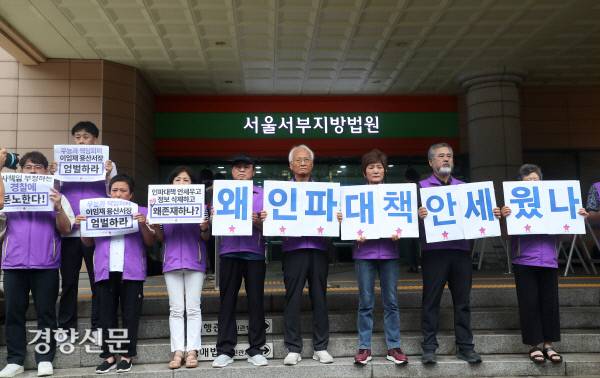 이태원 참사 유가족협의회와 시민대책회의 관계자들이 22일 오전 이임재 전 용산경찰서장의 공판이 열리는 서울서부지방법원 앞에서 책임자 엄벌을 촉구하는 손팻말을 들고 있다. 2024.7.22. 정지윤 선임기자