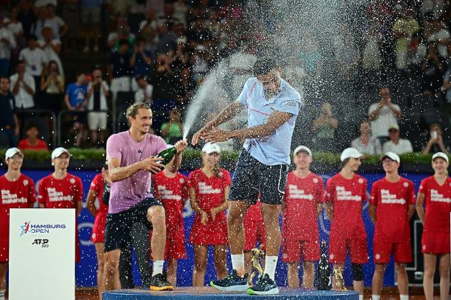 <피스를 축하해주는 즈베레프 (사진 = 함부르크오픈 홈페이지. https://hamburgopenatp500.com/en/gallery-21-7-2024/)>
