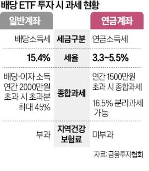 22일 금융투자협회에 따르면 국내 배당 ETF에서 나오는 분배금은 배당소득세(15.4%)로 원천징수된다. 문제는 배당소득과 이자소득 합계가 연 2000만원을 넘으면 금융소득종합과세 대상자가 된다는 점이다. 금융소득종합과세는 2000만원 초과분에 대해 다른 소득과 합산해 누진세율(6.6∼49.5%)로 소득세를 매기는 것이다. 노후 생활비로 월 200만원씩만 받도록 설계해도 세금 폭탄 대상자가 된다는 얘기다.