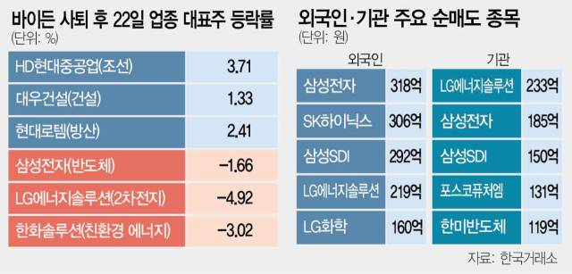 반면 트럼프 전 대통령 재집권 시 러시아·우크라이나 전후 재건 수혜 기대를 받는 건설 업종 주가는 하락장에서도 0.91% 올라 대조를 이뤘다. HD현대중공업(329180)(3.71%), HD한국조선해양(7.18%) 등 조선주와 현대로템(064350)(2.41%) 등 일부 방산주도 상승했다. 갤럭시아머니트리(12.11%), 우리기술투자(3.55%), 한화투자증권(2.16%) 등 가상자산주 또한 ‘트럼프 대세론’을 타고 재차 뛰어올랐다.