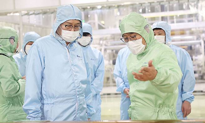 정인교 산업통상자원부 통상교섭본부장(왼쪽)이 22일 폴리이미드(PI) 필름 분야 세계 1위 기업인 PI첨단소재 충북 진천공장에서 생산라인을 둘러보고 있다.