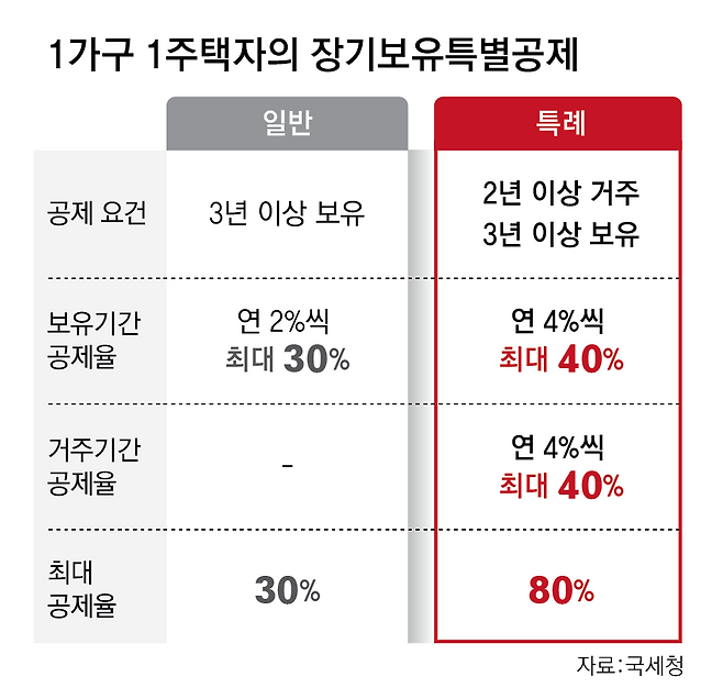 일반적인 장기보유특별공제는 보유 기간이 3년 이상일 때 연 2%씩 최대 30%까지 공제한다. 1가구 1주택자는 이보다 공제율이 높은 특례 장기보유특별공제를 적용한다. 단 거주 기간 2년 이상이라는 요건을 채워야 한다. 2년 이상 거주했다면 거주 기간과 보유 기간에 따라 각각 4%씩 최대 80%까지 공제받을 수 있다.