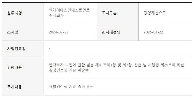 엔케이에스인베스트먼트는 내년 1월 22일까지 조건을 충족하지 못할 시 최대 6개월의 2차 시정명령을 받게 된다. 2차 시정명령 이후에도 경영 상황이 개선되지 않으면 벤처투자회사 등록 말소 여부를 심사해 창투사 라이선스를 반납해야 한다.
