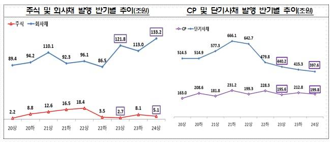 올해 상반기 국내 기업이 주식과 회사채를 조달해 약 140조원의 자금을 조달한 것으로 집계됐다. HD현대마린솔루션과 에이피알 등 대형 기업공개(IPO)의 영향으로 기업의 자금 조달 실적이 전년보다 10% 이상 증가했다.