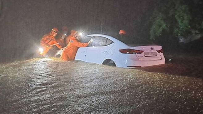 지난 22일 오후 11시 17분쯤 강원 철원군 갈말읍의 한 도로에서는 갑자기 불어난 빗물에 승용차가 침수됐습니다.