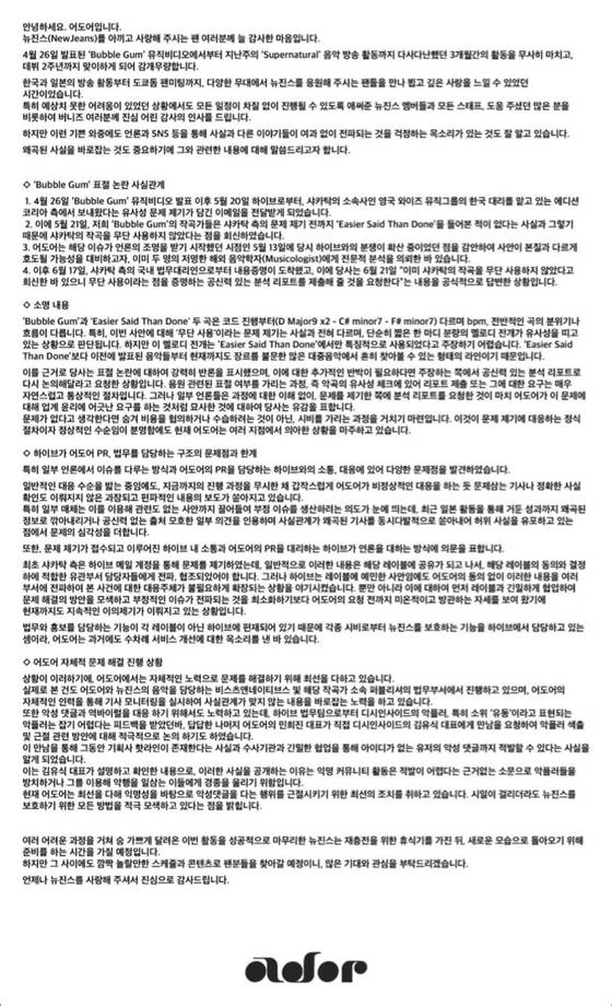 이를 근거로 당사는 표절 논란에 대하여 강력히 반론을 표시했으며, 이에 대한 추가적인 반박이 필요하다면 주장하는 쪽에서 공신력 있는 분석 리포트로 다시 논의해달라고 요청한 상황입니다. 음원 관련된 표절 여부를 가리는 과정, 즉 악곡의 유사성 체크에 있어 리포트 제출 또는 그에 대한 요구는 매우 자연스럽고 통상적인 절차 입니다. 그러나 일부 언론들은 과정에 대한 이해 없이, 문제를 제기한 쪽에 분석 리포트를 요청한 것이 마치 어도어가 이 문제에 대해 업계 윤리에 어긋난 요구를 하는 것처럼 묘사한 것에 대하여 당사는 유감을 표합니다.