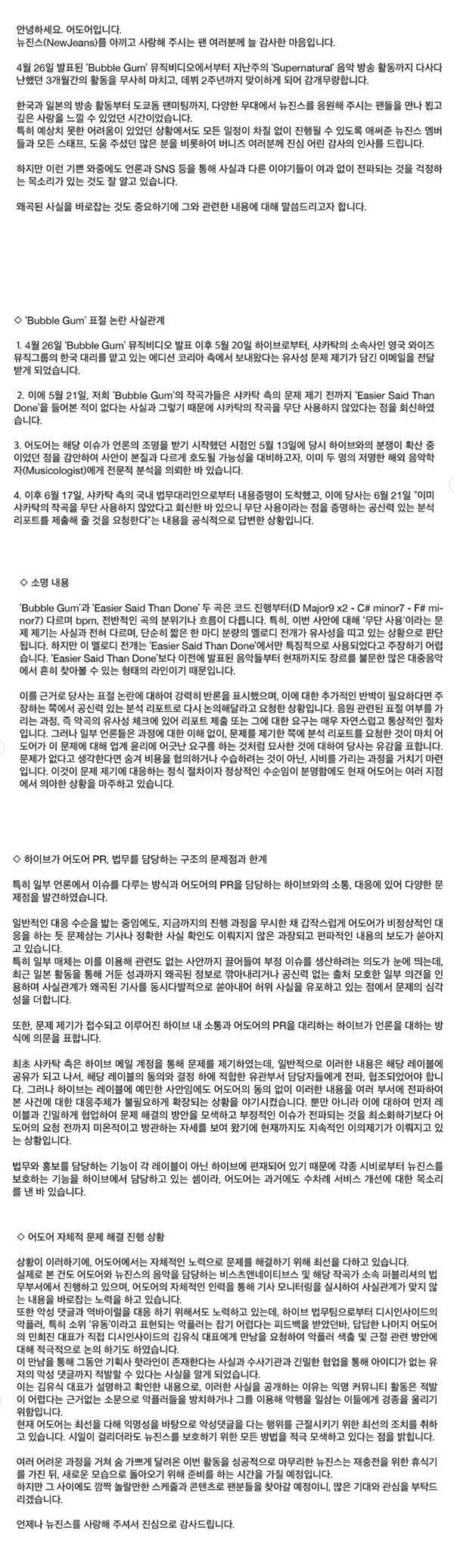 그러면서 "어도어는 해당 이슈가 언론의 조명을 받기 시작했던 시점인 5월 13일에 당시 하이브와의 분쟁이 확산 중 이었던 점을 감안하여 사안이 본질과 다르게 호도될 가능성을 대비하고자, 이미 두 명의 저명한 해외 음악학 자(Musicologist)에게 전문적 분석을 의뢰한 바 있다"고 알렸다.