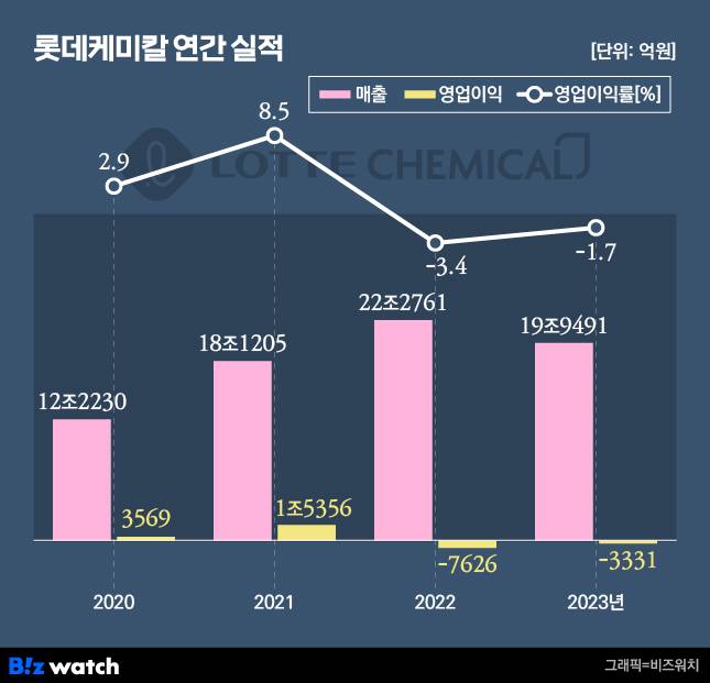 아울러 고유가 상황이 겹치면서 기초화학 비중이 큰 롯데케미칼은 직격탄을 맞았습니다. 롯데케미칼은 2022년 연결 기준 7226억원의 영업손실을 내며 적자 전환했고, 지난해에도 3331억원의 손실을 기록했습니다.