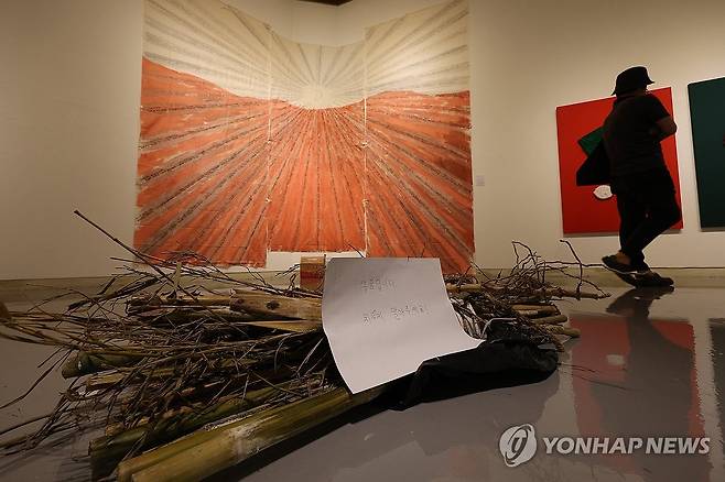 (대구=연합뉴스) 윤관식 기자 = 23일 대구문화예술회관 2층에서 열린 대구현대미술가협회 2024년도 기획전 '우리가 하려는 그 무엇'을 찾은 관람객이 작품을 살펴보고 있다. 2024.7.23