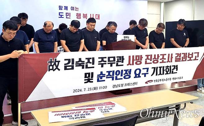 전국공무원노동조합 경남본부(본부장 강수동)는 23일 경남도청 프레스센터에서 기자회견을 열어, 지난 2월 25일 사망한 고(故) 김숙진 주무관과 관련한 진상조사 결과를 발표했다.