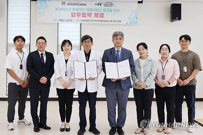 (춘천=연합뉴스) 23일 강원특별자치도재활병원 공공어린이 재활의료센터에서 관계자들이 강원대학교병원 발달장애인거점병원·행동발달증진센터 관계자들과 발달장애인 맞춤형 지원체계 구축 업무협약을 맺고 기념 촬영을 하고 있다.