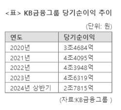 KB금융은 올해 상반기 당기순이익이 지난해 같은 기간보다 7.5% 감소한 2조7815억원으로 집계됐다고 23일 밝혔다. 특히 2·4분기 당기순이익은 고금리 속에 대출 규모가 커지면서 이자 이익이 늘어난 데다 홍콩 H지수가 예상보다 높은 수준을 유지하고 ELS 손실보상 환입과 대손충당금 환입 1320억원 등 일회성 이익이 반영되면서 지난해 같은 기간보다 15.56% 늘어난 1조7324억원을 냈다. KB금융그룹 재무담당임원은 "ELS 손실비용 환입과 대손충당금 환입 등 일회성 이익을 제외한 경상적 2·4분기 당기순이익은 1조 6000억원 수준"이라면서 "하반기에도 보수적인 충당금 적립 기조와 다각화된 그룹 포트폴리오를 바탕으로 안정적인 이익체력을 유지하는 등 지속가능한 성장 기반을 확보할 수 있도록 최선을 다하겠다"고 강조했다.